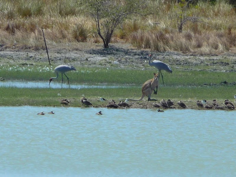 Then, just outside of Karumba we saw some more ponds and these had kangaroos as well as birds happily feeding around them. I am assuming that in the wet the habitat of these birds is much more free-ranging, but in the dry they are forced to congregate around the more "suitable" waterholes. It certainly is a spectacle that has worked in my favour.